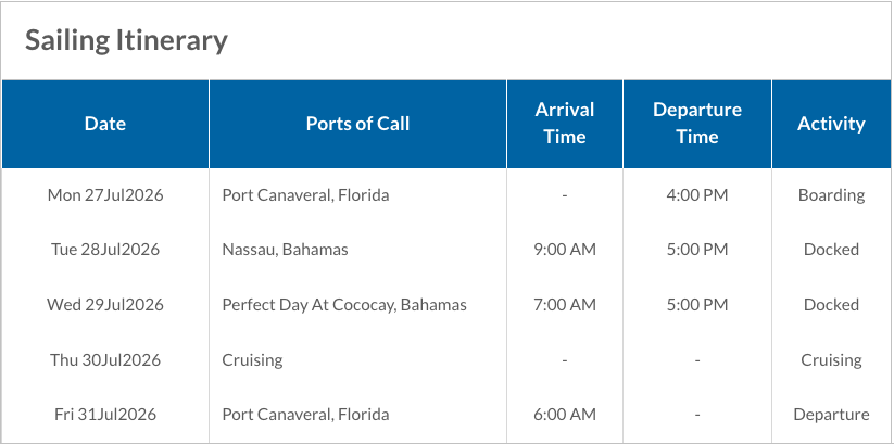 Fares include taxes and port fees. Airfare, travel insurance, transfers, parking, port adventures, sodas, alcohol, internet, premium dining and other services onboard are not included unless otherwise noted in the inclusions. Additional categories are available at current published rates.